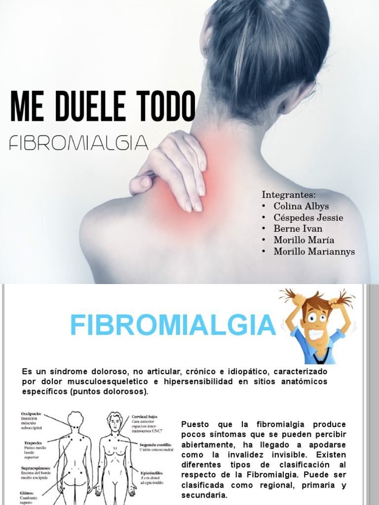 Cuando una persona tiene fibromialgia, es muy probable que estén presentes los puntos dolorosos en la espalda y en el. #fibromialgia #comocurar #fibromialgiasintomas la palabra fibromialgia (fm) significa dolor en los músculos y en el tejido fibroso (ligamentos y tendones). No existen pruebas de laboratorio que puedan detectarla, por lo que le corresponde a su médico. La fibromialgia es una enfermedad crónica del sistema nervioso central con una notable reducción de serotonina y otras. Las personas con fibromialgia tienen dolor y sensibilidad en todo el cuerpo.